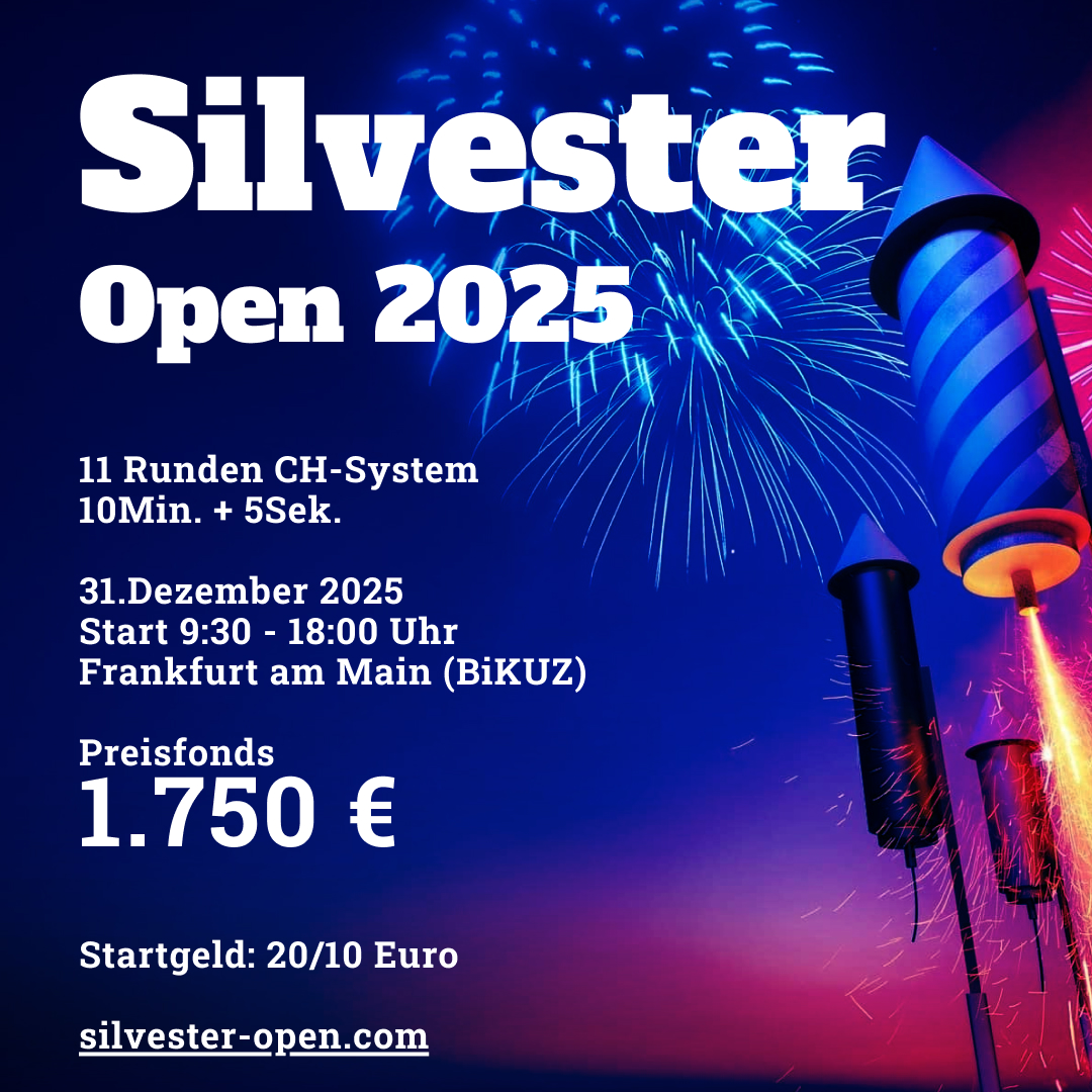 Auch in 2025 veranstalten die Schachfreunde ein Silvester Open. Da das Event in 2024 ein voller Erfolg war, wollen wir diese Turnierserie fortsetzen. Die Ausschreibung findet Ihr hier. Wir freuen uns auf zahlreiche Anmeldungen!
